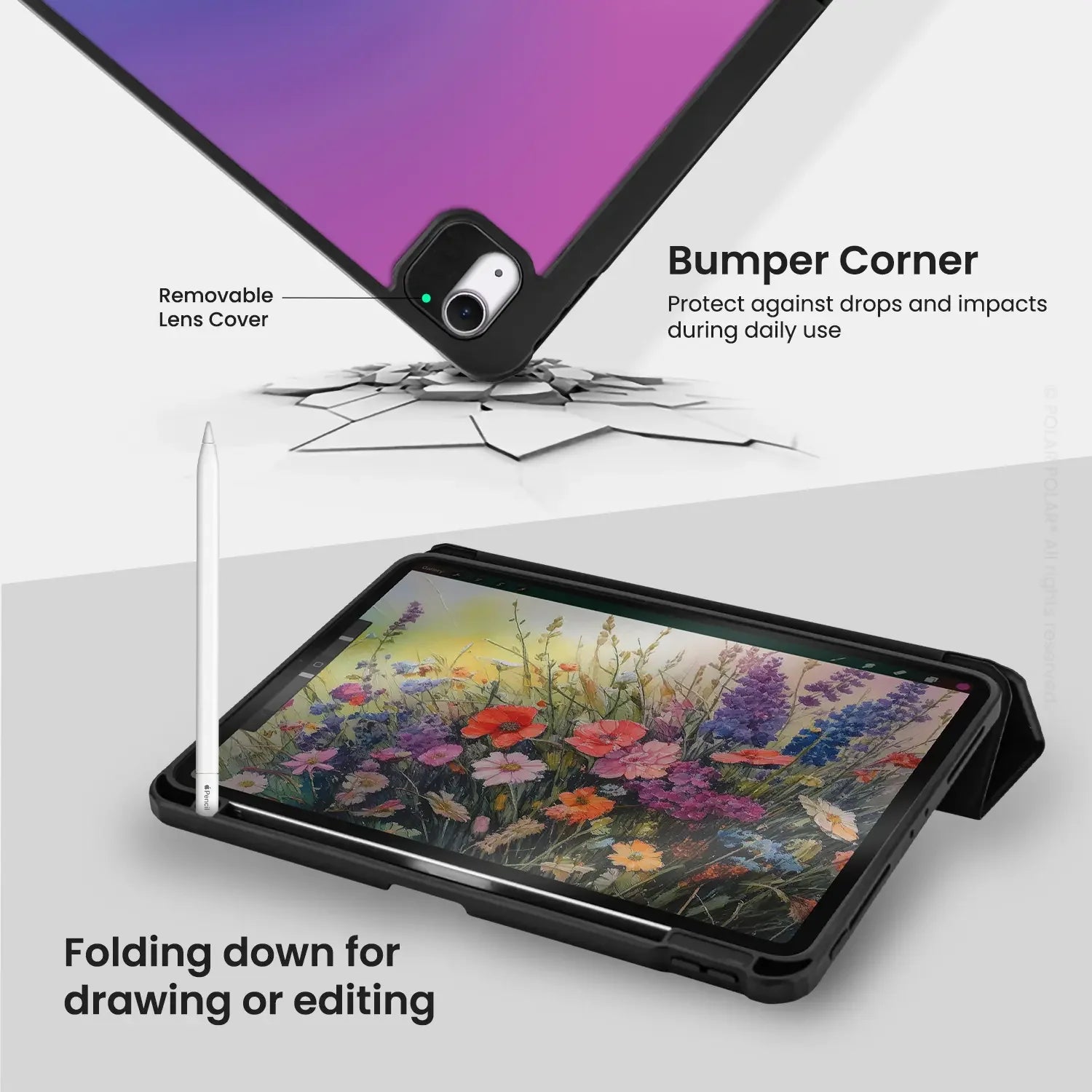 Open the cover to wake the iPad and close it to put it to sleep automatically. The pencil slot enables the Apple Pencil to charge while you're on the go.