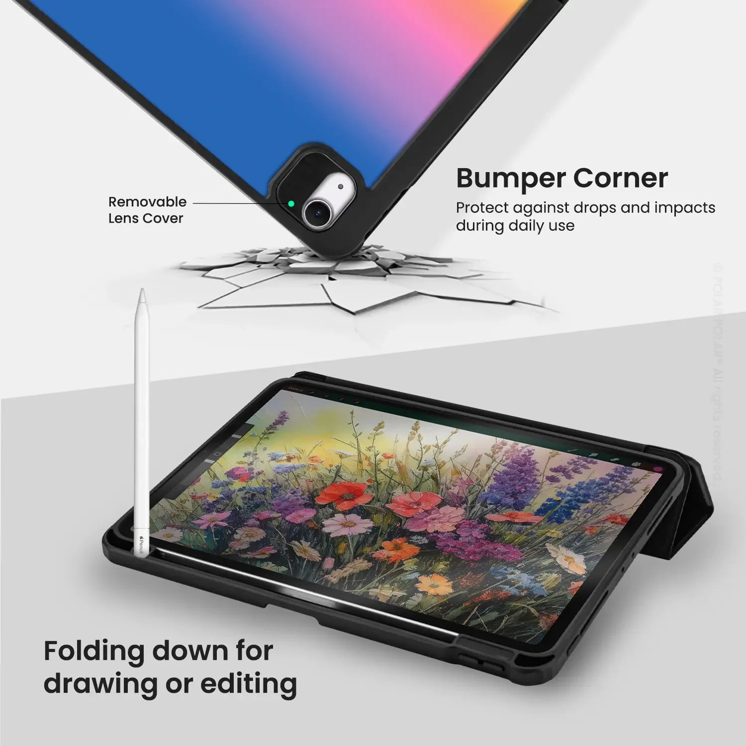 Open the cover to wake the iPad and close it to put it to sleep automatically. The pencil slot enables the Apple Pencil to charge while you're on the go.