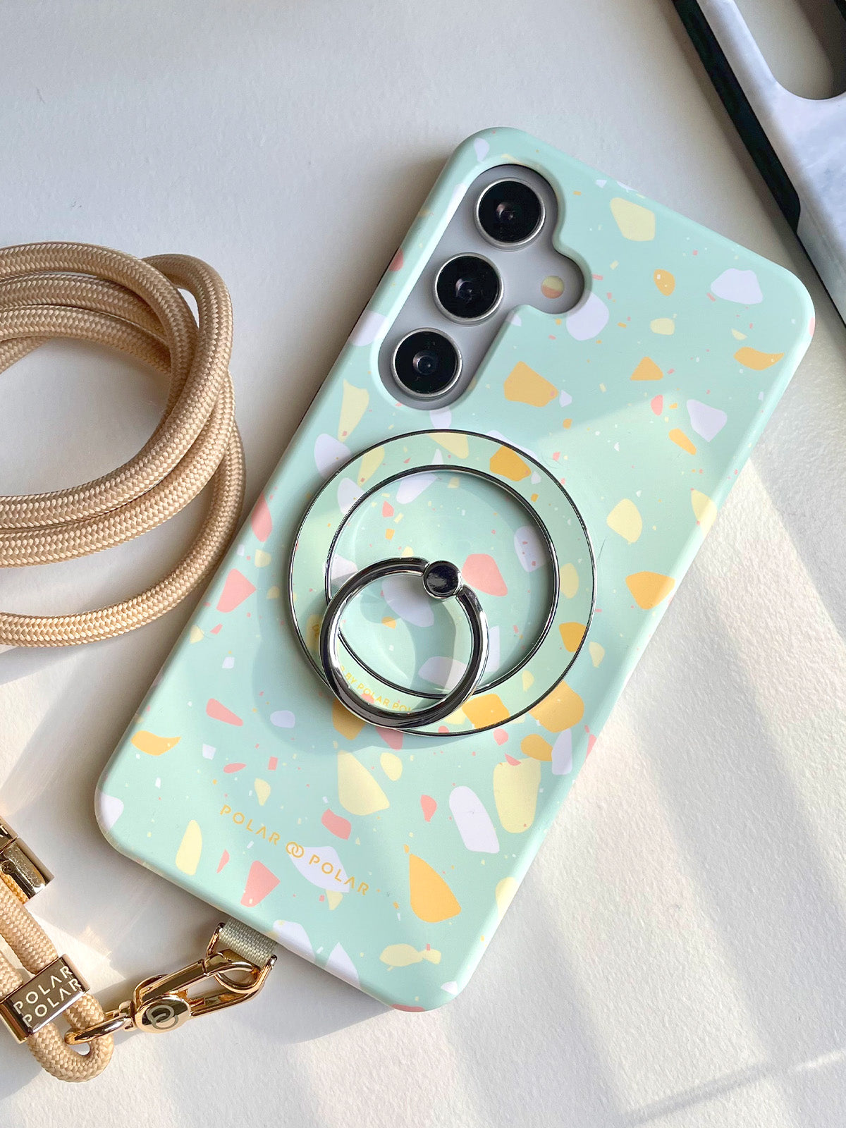 強力磁吸 MagSafe 兼容手機指環支架,配上使用 MagSafe 兼容保護殼,除了增添美感外觀,穩固吸附在磁吸手機殼上,讓您單手輕鬆發送簡訊、自拍、和支撐手機觀看影片,都一樣很方便。