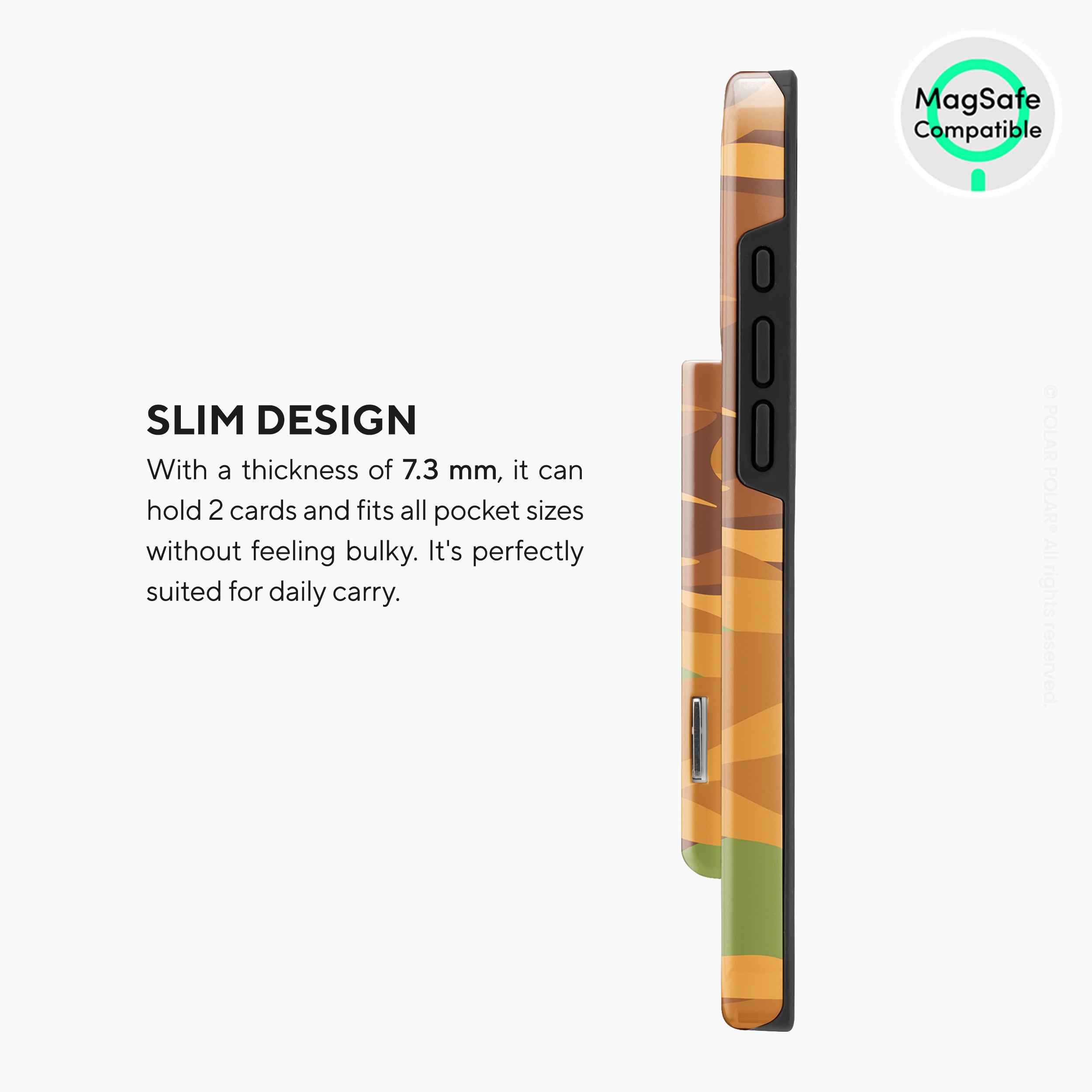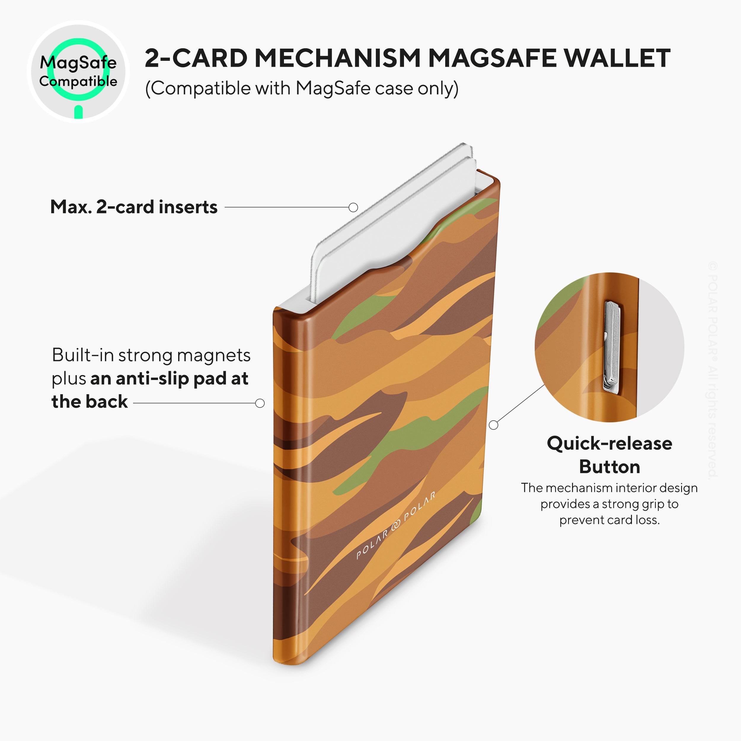 The slim hard MagSafe wallet confidently holds up to two cards with ease. Its expertly designed interior features a reliable mechanism that ensures your cards stay securely in place, reducing any risk of loss. With the quick-release button, accessing your cards is swift and effortless. Besides, the built-in magnets and anti-slip pad provide a strong and secure attachment to any MagSafe-compatible case.