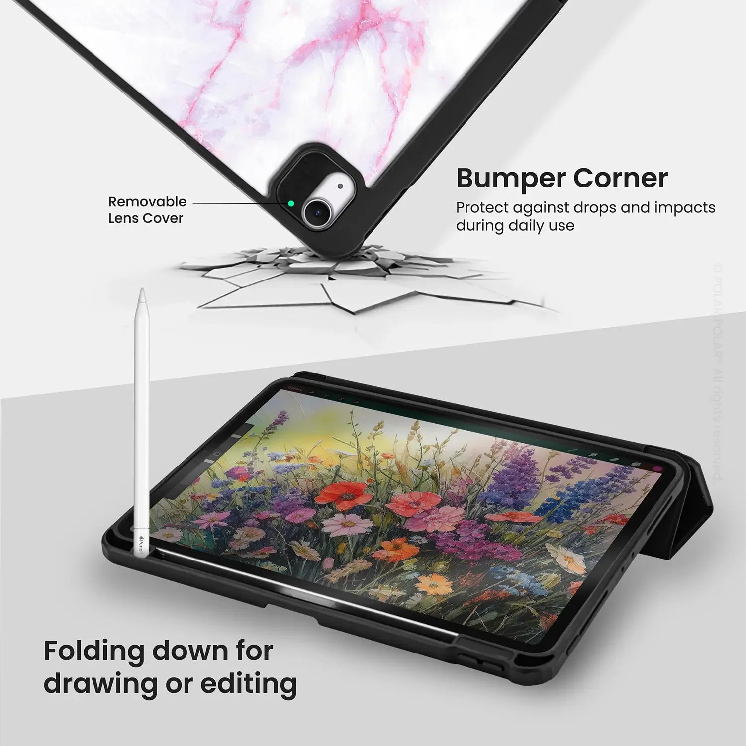 Open the cover to wake the iPad and close it to put it to sleep automatically. The pencil slot enables the Apple Pencil to charge while you're on the go.